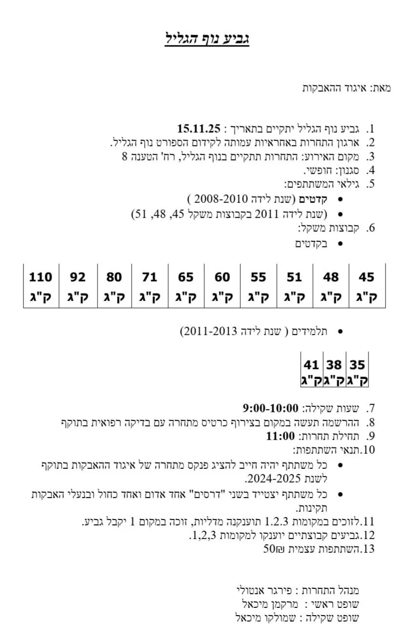 5. גילאי המשתתפים: בוגרים (שנת לידה 2010 ומטה). שנת 2011 מורשים להשתתף עד 60 ק”ג.