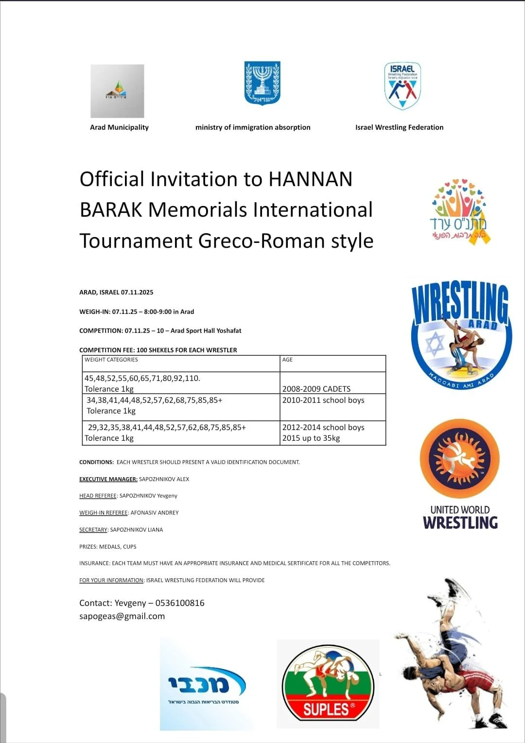1. בתאריך 26/12/2025 תתקיים אליפות ישראל לבוגרים U23 בסגנון יווני-רומי 2026 - חלק א’